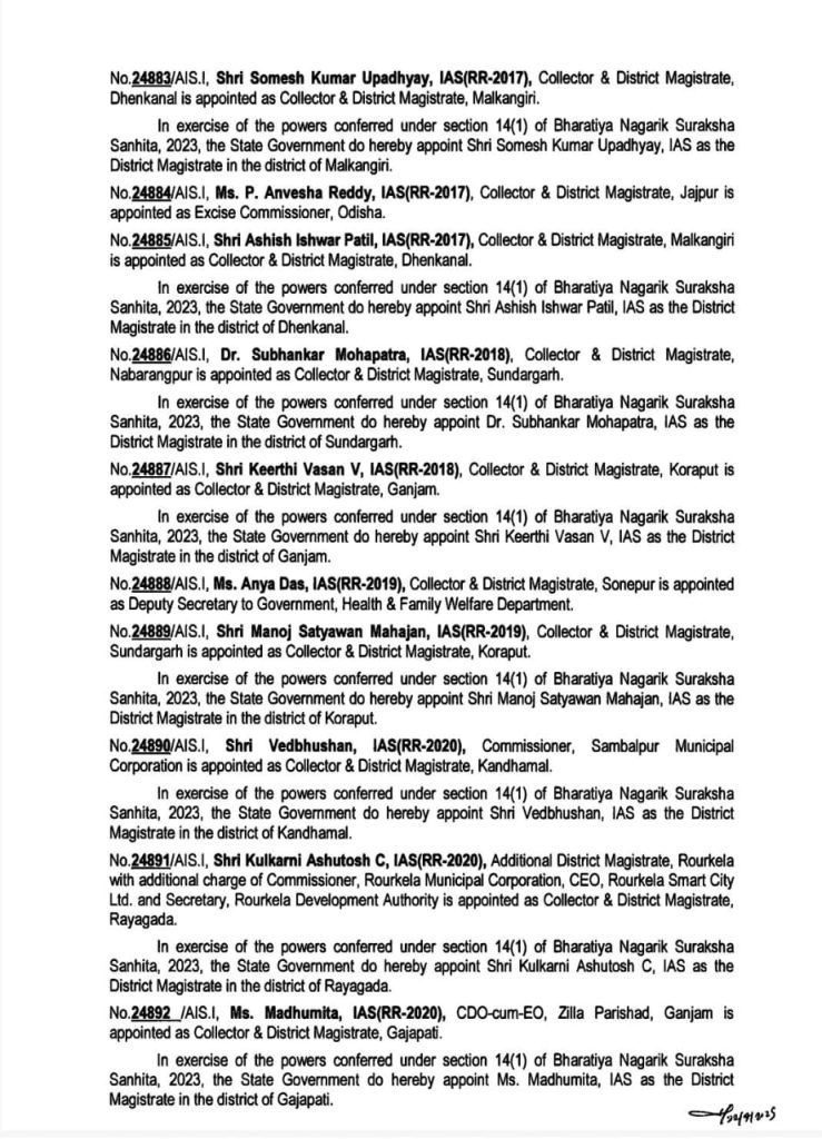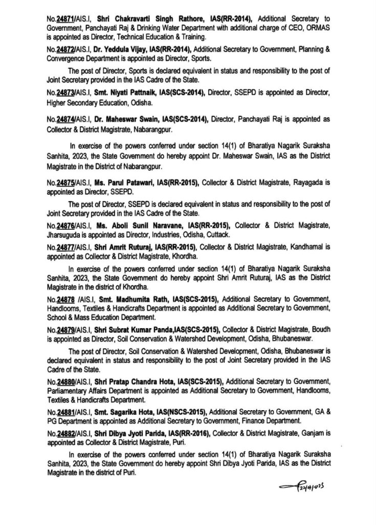 ସେହିପରି ବରିଷ୍ଠ ଆଇଏଏସ ଅଫିସର ରୂପା ରୋସନ ସାହୁ ରାଜ୍ୟପାଳଙ୍କ ସଚିବ ପ୍ରଦାନ କରାଯାଇଛି । ସେହିପରି ଅମ୍ରିତ ଋତୁରାଜ ଖୋର୍ଦ୍ଦା ଜିଲ୍ଲାପାଳ ହୋଇଛନ୍ତି । ଦିବ୍ୟଜ୍ୟୋତି ପରିଡ଼ାଙ୍କୁ ପୁରୀ ଜିଲ୍ଲାପାଳ ଦାୟିତ୍ବ ପ୍ରଦାନ କରାଯାଇଛି । ଏବେ ନଜର ପକାଇବା ଅନ୍ୟ ବିଭାଗର ଅଦଳ ବଦଳ ଉପରେ ।