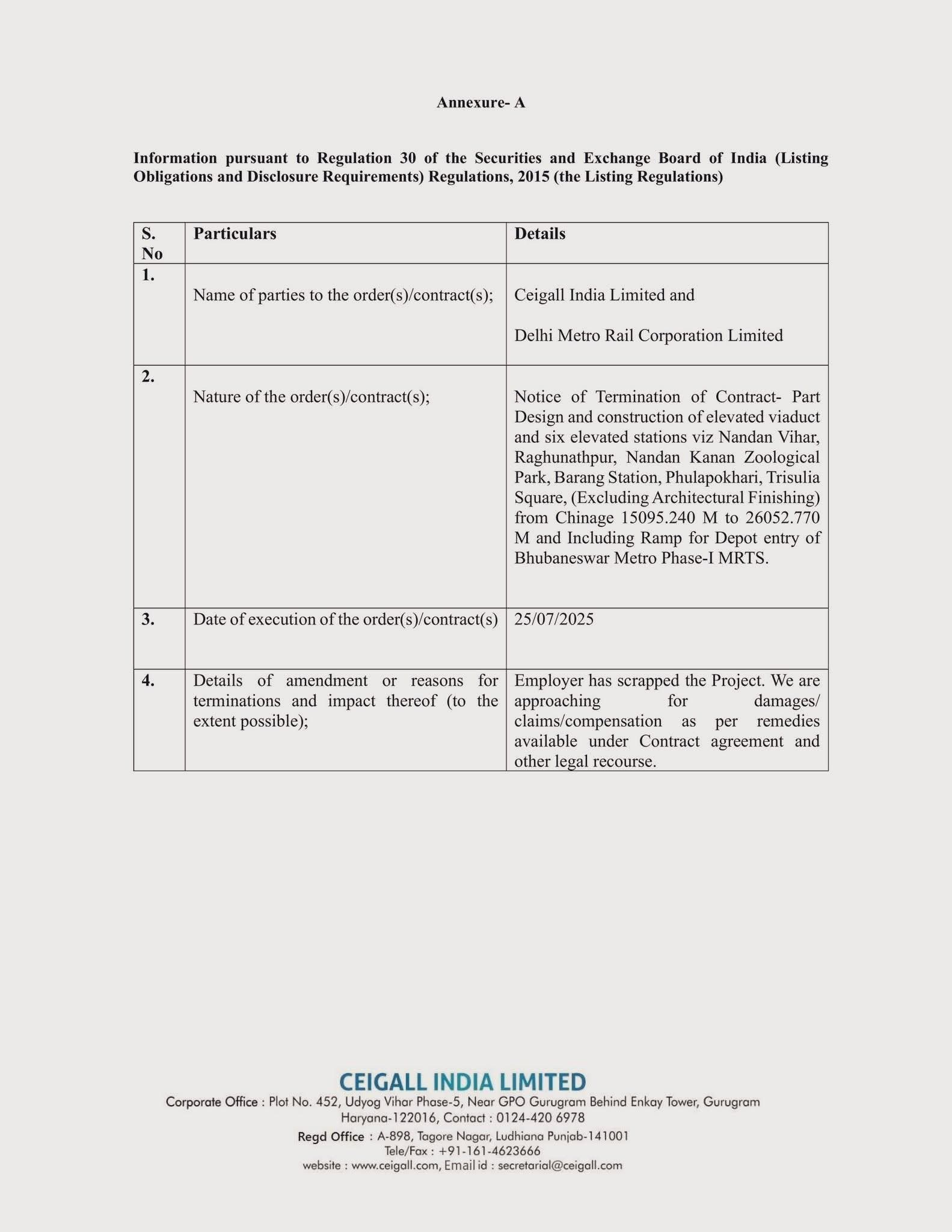 ଭୁବନେଶ୍ବର ମେଟ୍ରୋ ପ୍ରକଳ୍ପ ପାଇଁ ହୋଇଥିବା କଣ୍ଟ୍ରାକ୍ଟ ବାତିଲ । କାର୍ଯ୍ୟ ବିଳମ୍ବ ହେଉଥିବାରୁ ଠିକା ସଂସ୍ଥାର କଣ୍ଟ୍ରାକ୍ଟ ବାତିଲ । ଠିକା ସଂସ୍ଥା ସିଗାଲ ଇଣ୍ଡିଆ ଓ ରଞ୍ଜିତ ବିଲ୍ଡକନ୍ ସହ କଣ୍ଟ୍ରାକ୍ଟ ବାତିଲ । କଣ୍ଟ୍ରାକ୍ଟ ବାତିଲ କଲା ଦିଲ୍ଲୀ ମେଟ୍ରୋ ରେଲ୍ କର୍ପୋରେସନ୍ । ଦିଲ୍ଲୀ ମେଟ୍ରୋ ଓ ସିଗାଲ ଇଣ୍ଡିଆ ସହ ହୋଇଥିବା ଚୁକ୍ତି ବାତିଲ। ୬ଟି ମେଟ୍ରୋ ଷ୍ଟେସନ ପାଇଁ ଥିବା ଟେଣ୍ଡର ବାତିଲ ।