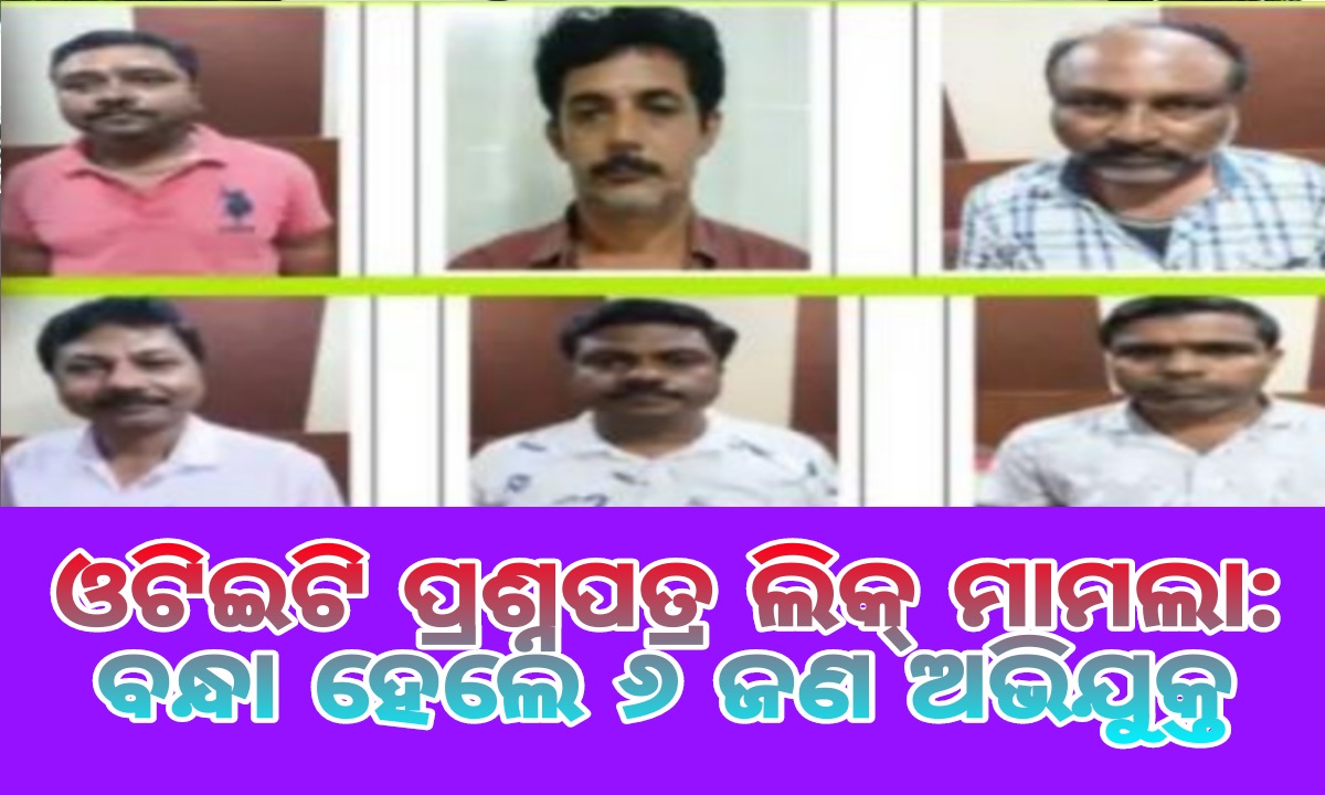 ଓଡ଼ିଶା ଟିଚର ଇଲିଜିବିଲିଟି ଟେଷ୍ଟ (ଓଟିଇଟି) ପ୍ରଶ୍ନପତ୍ର ଲିକ୍ ମାମଲାରେ ଓଡ଼ିଶା ପୁଲିସର କ୍ରାଇମ୍ବ୍ରାଞ୍ଚ ୬ ଜଣ ଅଭିଯୁକ୍ତଙ୍କୁ ଗିରଫ କରିଛି। ଗିରଫ ଅଭିଯୁକ୍ତମାନେ ହେଲେ ଜୀତନ ମହାରାଣା, ବିଜୟ କୁମାର ମିଶ୍ର, ସନାତନ ବିଶୋୟୀ, ରାମଜୀ ପ୍ରସାଦ ଗୁପ୍ତା, ଅଜୟ କୁମାର ସାହୁ ଓ ଜୟନ୍ତ କୁମାର ରାଉତ।ଓଟିଇଟି ପ୍ରଶ୍ନପତ୍ର ଲିକ୍ ମାମଲାରେ ୬ ଜଣ ଅଭିଯୁକ୍ତଙ୍କ ଗିରଫ ନେଇ କ୍ରାଇମବ୍ରାଞ୍ଚ ଡିଜି ସାମ୍ବାଦିକ ସମ୍ମିଳନୀରେ ସୂଚନା ଦେଇଛନ୍ତି।