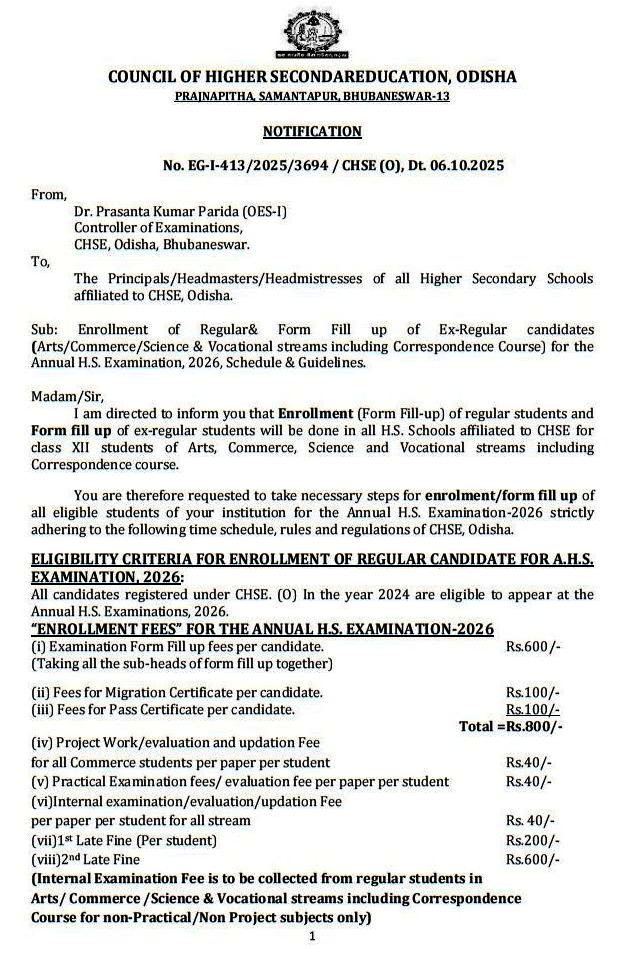 ଆସନ୍ତା ୧୩ରୁ ୨୫ ତାରିଖ ମଧ୍ୟରେ ବିନା ଜରିମାନାରେ ଫର୍ମ ପୂରଣ କରିପାରିବେ। ବିନା ଜରିମାନାରେ ଫର୍ମ ପୂରଣ ସରିବା ପରେ ଏକା ସମୟରେ ଜରିମାନା ଦେଇ ଉଭୟ ରେଗୁଲାର୍ ଓ ଏକ୍ସ-ରେଗୁଲାର୍ ଛାତ୍ରଛାତ୍ରୀମାନେ ଫର୍ମ ପୂରଣ କରିପାରିବେ। ନଭେମ୍ବର ୧୦ରୁ ୧୪ ତାରିଖ ମଧ୍ୟରେ ୨୦୦ଟଙ୍କା ଫାଇନ୍ ଏବଂ ନଭେମ୍ବର ୧୭ରୁ ୧୯ତାରିଖ ମଧ୍ୟରେ ୬୦୦ଟଙ୍କା ଫାଇନ୍ ଦେଇ ଫର୍ମ ପୂରଣ କରିବେ। ଏନେଇ ସିଏଚ୍ଏସ୍ଇ ପକ୍ଷରୁ ପରୀକ୍ଷା ନିୟନ୍ତ୍ରକ ଡ. ପ୍ରଶାନ୍ତ କୁମାର ପରିଡ଼ା ସମସ୍ତ ଉଚ୍ଚ ମାଧ୍ୟମିକ ବିଦ୍ୟାଳୟଗୁଡ଼ିକୁ ଅବଗତ କରିଛନ୍ତି।