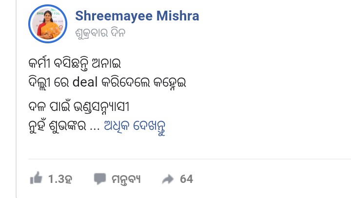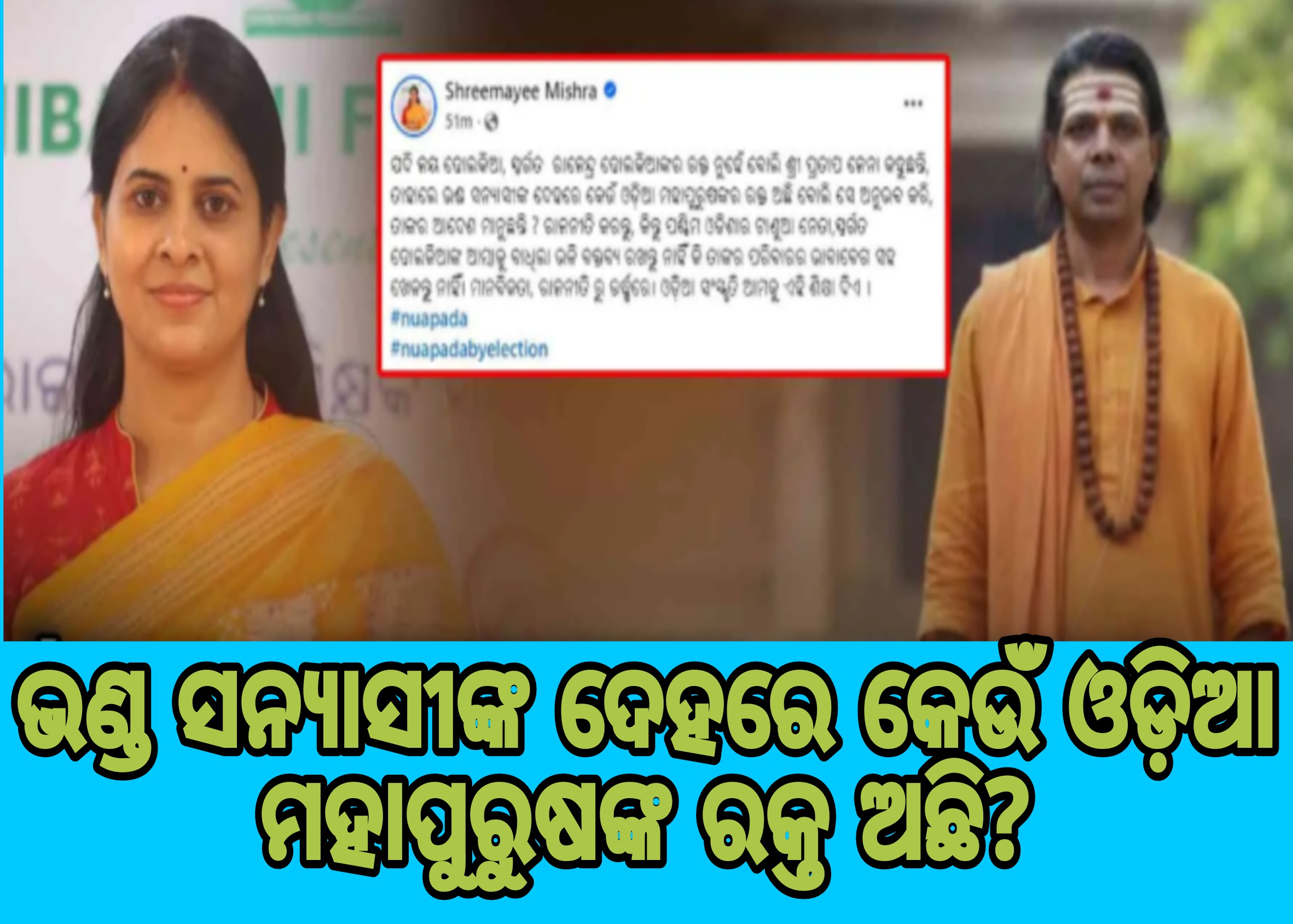 ଜେଏମଜେ ବ୍ୟୁରୋ : ପୁଣି ସୋସିଆଲ ମିଡ଼ିଆ ପୋଷ୍ଟରେ ଟାର୍ଗେଟ କଲେ ଶ୍ରୀମୟୀ । ପ୍ରତାପ ଜେନାଙ୍କ ମନ୍ତବ୍ୟକୁ ନେଇ ମାରିଲେ ତେରେଛା ବାଣ । କହିଲେ ଭଣ୍ଡ ସନ୍ନ୍ୟାସୀଙ୍କ ଦେହରେ କେଉଁ ଓଡ଼ିଆ ମହାପୁରୁଷଙ୍କର ରକ୍ତ ଅଛି’।