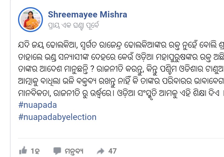 ସେ ସୋସିଆଲ ମିଡିଆରେ ଲେଖିଛନ୍ତି, ଜୟ ଯଦି ରାଜେନ୍ଦ୍ର ଢୋଲକିଆଙ୍କର ରକ୍ତ ନୁହେଁ ବୋଲି ପ୍ରତାପ ଜେନା କହୁଛନ୍ତି । ତାହାଲେ ଭଣ୍ଡ ସନ୍ନ୍ୟାସୀଙ୍କ ଦେହରେ କେଉଁ ଓଡ଼ିଆ ମହାପୁରୁଷଙ୍କର ରକ୍ତ ଅଛି । କେଉଁ ମହାପୁରୁଷଙ୍କର ରକ୍ତ ଅଛି ଭାବି ତାଙ୍କ ଆଦେଶ ମାନୁଛନ୍ତି ପ୍ରତାପ । ସ୍ୱର୍ଗତ ଢୋଲକିଆଙ୍କ ଆତ୍ମାକୁ ବାଧିଲା ଭଳି ବକ୍ତବ୍ୟ ରଖନ୍ତୁ ନାହିଁ ବୋଲି ପୋଷ୍ଟରେ ଉଲ୍ଲେଖ କରିଛନ୍ତି ଶ୍ରୀମୟୀ । ତେବେ ଶ୍ରୀମୟୀଙ୍କ ସୋସିଆଲ ମିଡିଆ ପୋଷ୍ଟ ନେଇ ବିଜେଡି ନେତାଙ୍କ ପ୍ରତିକ୍ରିୟା ମିଳିପାରିନି ।