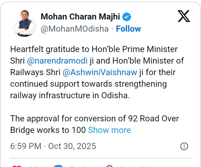 ଏନେଇ ସୋସିଆଲ୍ ମିଡିଆ X ମାଧ୍ୟମରେ ସୂଚନା ଦେଇଛନ୍ତି ମୁଖ୍ୟମନ୍ତ୍ରୀ ମୋହନ ଚରଣ ମାଝୀ । ମୁଖ୍ୟମନ୍ତ୍ରୀ ଲେଖିଛନ୍ତି, “ଓଡ଼ିଶାରେ ରେଳ ଭିତ୍ତିଭୂମି ସୁଦୃଢ଼ କରୁଥିବାରୁ ହୃଦୟରୁ ପ୍ରଧାନମନ୍ତ୍ରୀ ନରେନ୍ଦ୍ର ମୋଦି ଏବଂ ରେଳମନ୍ତ୍ରୀ ଅଶ୍ଵିନୀ ବୈଷ୍ଣବଙ୍କୁ ଧନ୍ୟବାଦ ଜଣାଉଛି