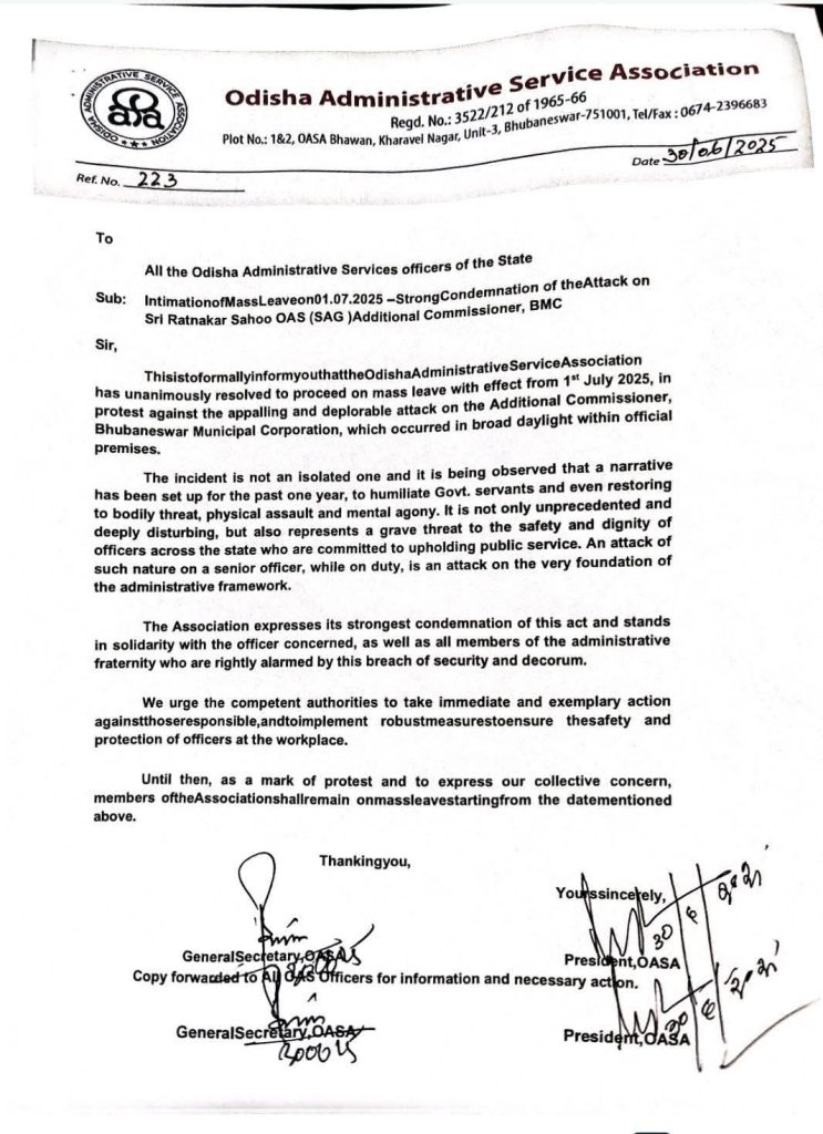 ଜେଏମଜେ ବ୍ୟୁରୋ : ସମୂହ ଛୁଟିରେ ଯିବେ OAS ଅଧିକାରୀ । ବିଏମସି ଅତିରିକ୍ତ କମିଶନରଙ୍କୁ ଆକ୍ରମଣ ଘଟଣା । ପ୍ରତିବାଦରେ ସମସ୍ତେ ଛୁଟିବାକୁ ନେଇଛନ୍ତି ନିଷ୍ପତ୍ତି । କାଲିଠାରୁ ସମୂହ ଛୁଟିରେ ଯିବେ OAS ଅଧିକାରୀ । OAS ଆସୋସିଏସନ ପକ୍ଷରୁ ଦିଆଗଲା ଆନ୍ଦୋଳନ ଡାକରା । ବିଏମସି ଅତିରିକ୍ତ କମିଶନରଙ୍କୁ ଆକ୍ରମଣର ପ୍ରତିବାଦରେ ଏହି ଆନ୍ଦୋଳନ କରାଯାଇଛି । ବିଏମସି ଅତିରିକ୍ତ କମିଶନରଙ୍କୁ ଆକ୍ରମଣକୁ OAS ଆସୋସିଏସନ ନିନ୍ଦା କରିଛି ।