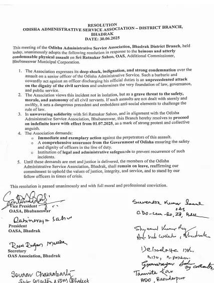 ସନ୍ଧ୍ୟାରେ ଓଏଏସ୍ ସଂଘର ପ୍ରତିନିଧି ଦଳ ମୁଖ୍ୟ ଶାସନ ସଚିବ ମନୋଜ ଆହୁଜା ଓ ପୁଲିସ ମହାନିର୍ଦ୍ଦେଶକ ୱାଇବି ଖୁରାନିଆଙ୍କୁ ଭେଟି ସମୂହ ଛୁଟି ନିଷ୍ପତ୍ତି ସମ୍ପର୍କରେ ଅବଗତ କରାଇଥିଲେ । ଓଏଏସ୍ ସଂଘ କହିଛି, କେବଳ ଏହି ଗୋଟିଏ ଘଟଣା ନୁହେଁ, ବର୍ଷେ ହେଲାଣି ସରକାରୀ ଅଧିକାରୀଙ୍କୁ ଅପମାନିତ କରିବାକୁ ଲଗାତର ଅପପ୍ରୟାସ ଚାଲିଛି । ଏଥିପାଇଁ ଅନେକ ମିଛ କାହାଣୀ ସୃଷ୍ଟି କରାଯାଉଛି । ଅଧିକାରୀମାନେ ଶାରୀରିକ ଆଘାତ ଓ ଅସଦାଚରଣ ସହିତ ମାନସିକ ଯନ୍ତ୍ରଣାକୁ ସାମ୍ନା କରୁଛନ୍ତି । ଏଭଳି ମାନସିକତା ଦୁର୍ଭାଗ୍ୟଜନକ ଓ ଗଭୀର ଚିନ୍ତାଜନକ । ରାଜ୍ୟରେ କାମ କରୁଥିବା ସବୁ ସରକାରୀ ଅଧିକାରୀଙ୍କ ସୁରକ୍ଷା ଓ ସମ୍ମାନ ପ୍ରତି ଏହା ଭୟଙ୍କର ବିପଦ ସୃଷ୍ଟି କରୁଛି । କାର୍ଯ୍ୟରତ ସରକାରୀ ଅଧିକାରୀଙ୍କ ଉପରେ ଆକ୍ରମଣର ଅର୍ଥ ପ୍ରଶାସନିକ ଢାଞ୍ଚା ଉପରେ ସିଧାସଳଖ ଆକ୍ରମଣ ।